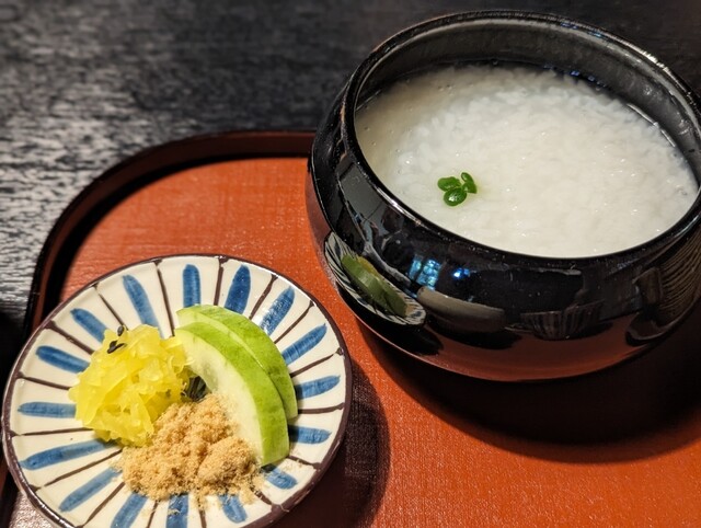 瓢亭玉子のとろりとした食感、鮎の香ばしさ、お粥の優しい口当たりと出汁餡をかけての味変。