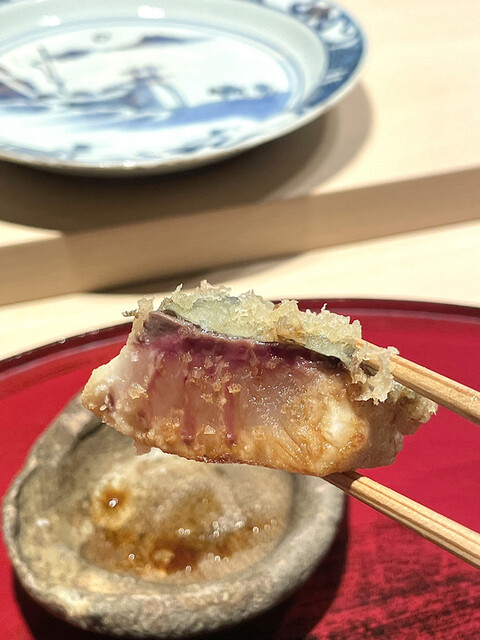 天ぷらで初めて見た、表面が螺鈿色に輝く白甘鯛のキュイソンナクレ。