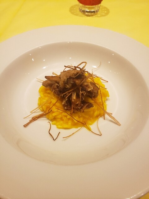リゾットは丁度良いお米の硬さで美味しかった、ジロール茸のフリットは味と食感が良い。