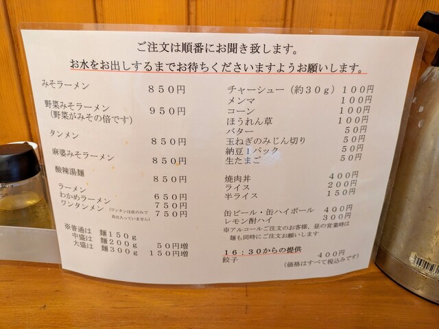 ワンオペの店主からお冷が提供されるタイミングで注文。