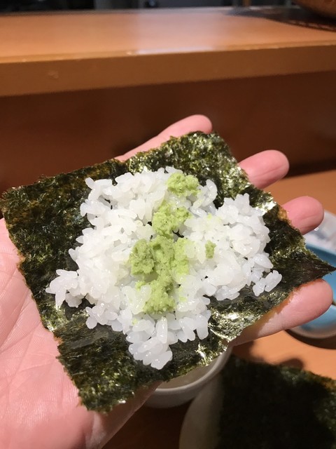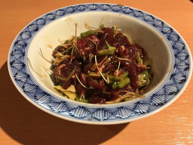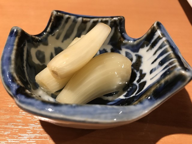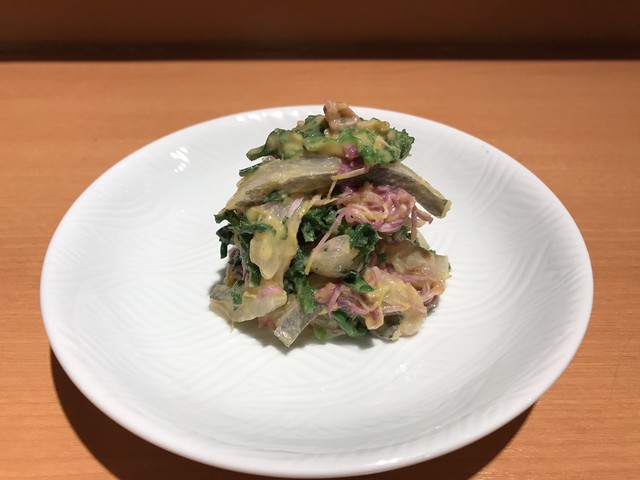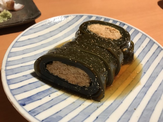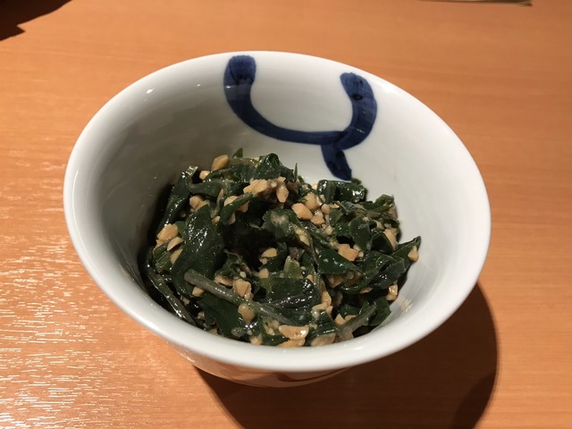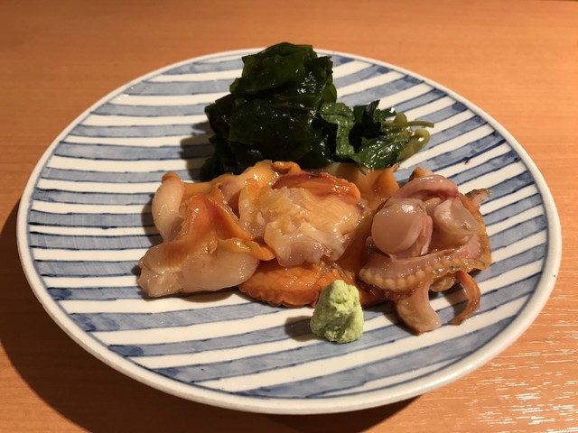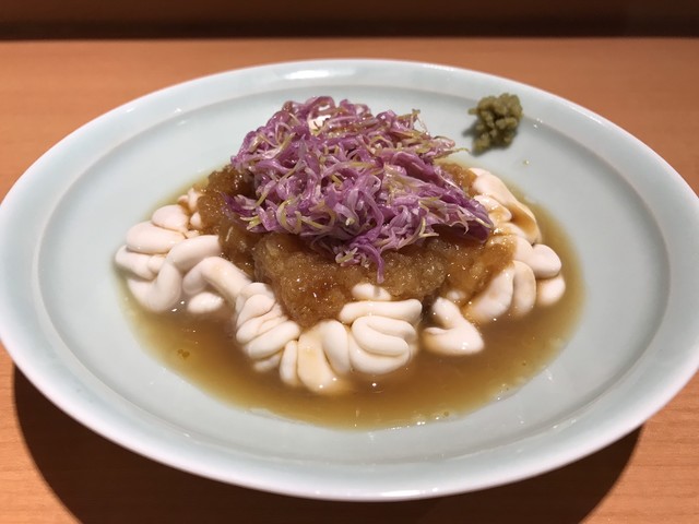 上等な包丁で細切りにされたヤリイカはエッジが白く中が透明でとても綺麗だ。それにマッチさせられたのは新鮮な このわた だ。イカの繊細な食感と甘み、このわたの爽やかな磯感が合わさる。繊細な味覚が問われる上質な珍味だ。