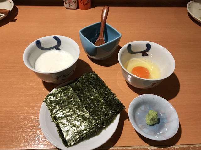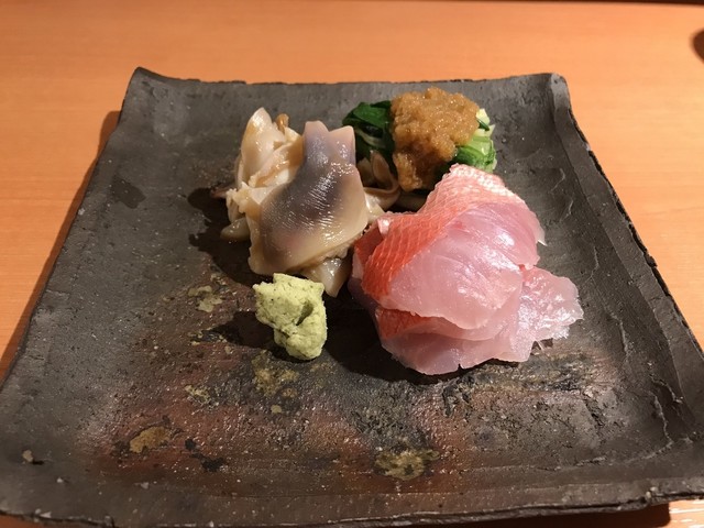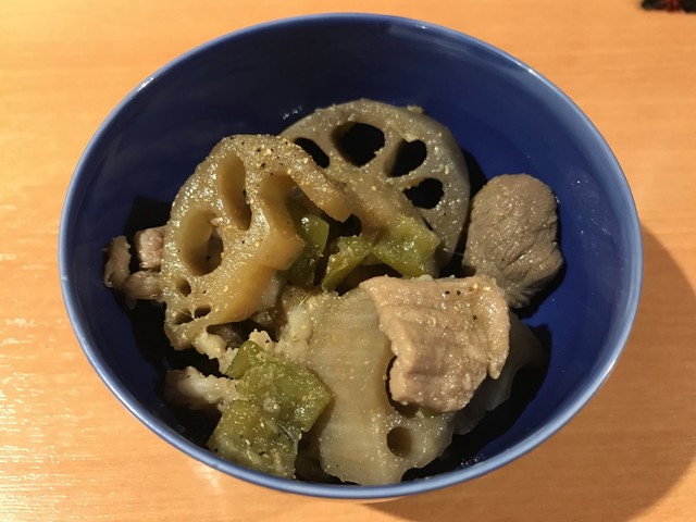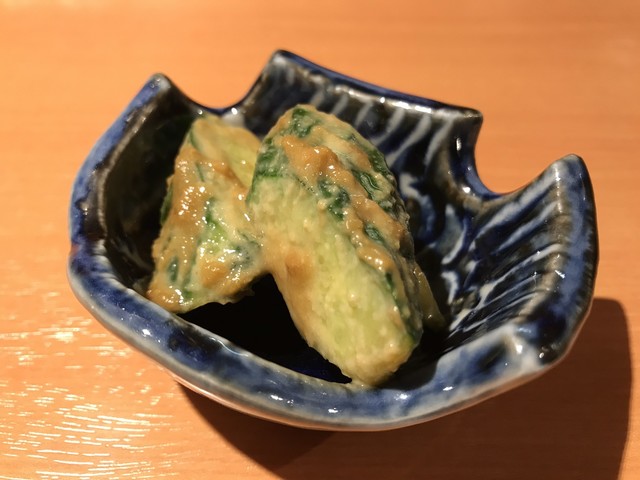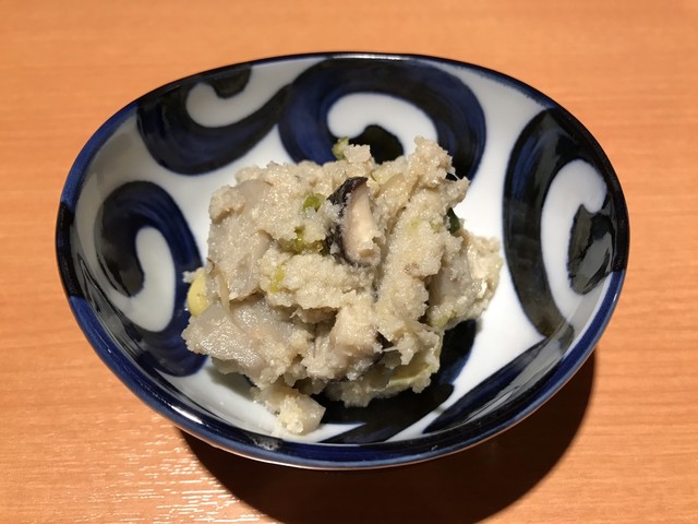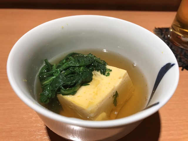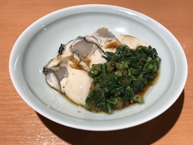 形のしっかりした新鮮なウニは程よく濃厚で舌触りが心地よい。それにマッチさせられた豆腐は地元の銘店 荻野豆腐 の絹ごし。しっかりとした豆の味わいとコクが特徴だ。それらが自家製のタレで合わさすことによりウニの上品な磯感と豆腐のコクが相乗し、とても完成度の高い珍味に。