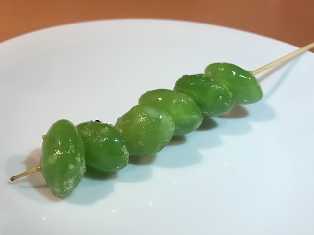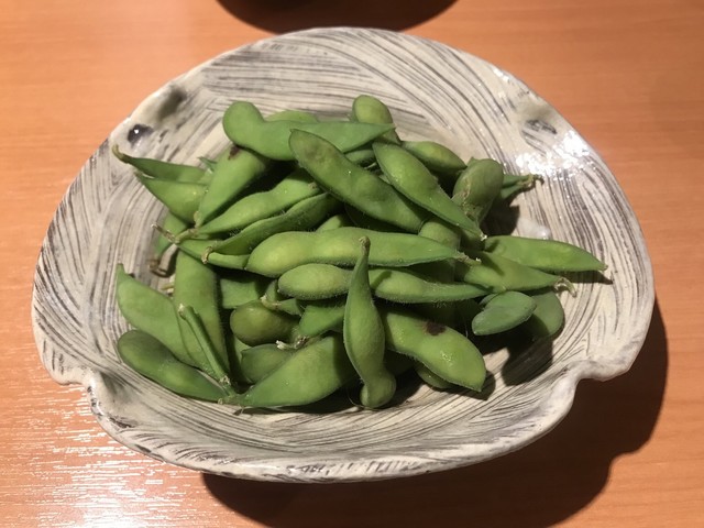 大将の実家の菜園から直送される枝豆。お母上が息子のために気持ちを込めた育てたものだとか。子供の頃から何十年も食べてきた大将本人による塩加減や茹で加減は絶対。茶豆のようなコクとアルデンテな噛み応え。