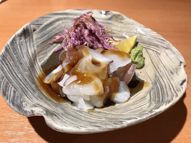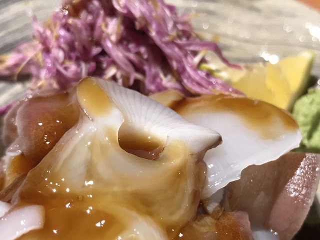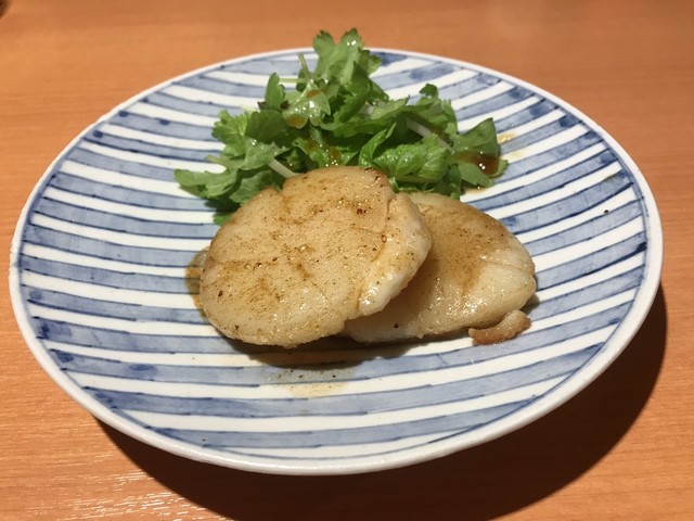 大きなホタテを香ばしく焼く。スライスされているので、まるでお煎餅のような形。コリっとした歯応えと舌先に貝柱の繊維の食感。