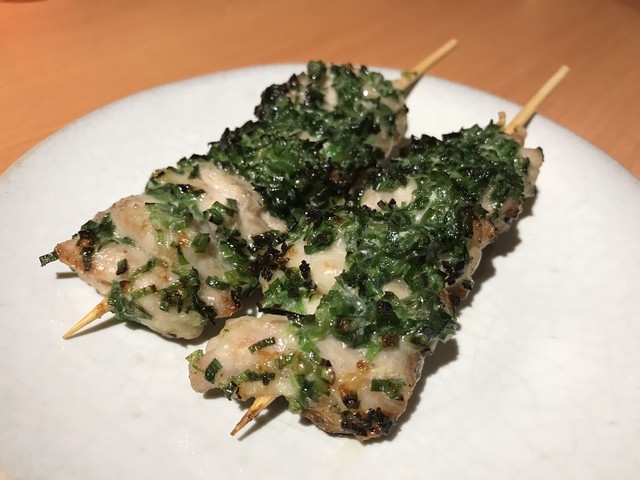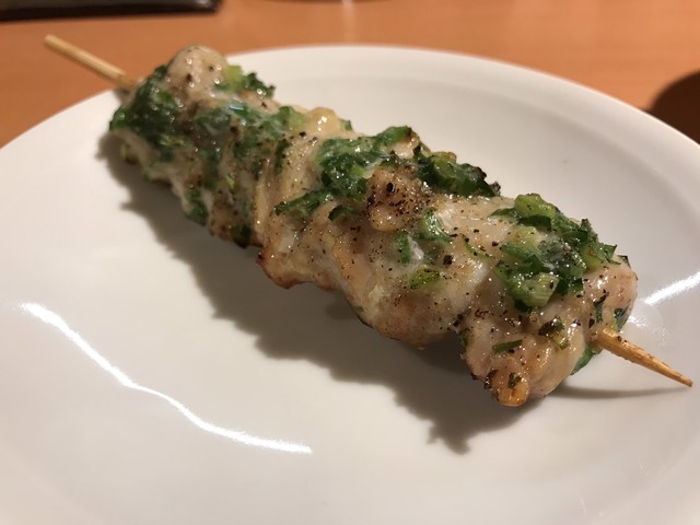 これこれ!新鮮な鳥の白レバーが入った時にしか作らない絶品メニュー。特製の味噌ペーストで漬けたレバーは芳醇の極み。歯ごたえも適度にしっかりしていて食べ進みやすい。勿論、臭みはまったくない。口の中で広がる芳醇さと旨味は一気に広がり、スーッと引いていく。後味は意外なほどにスッキリだ。白ワインにも合いそう。