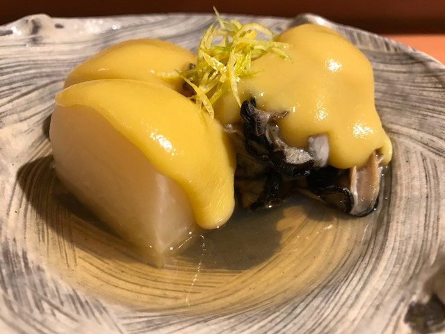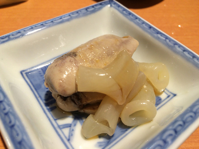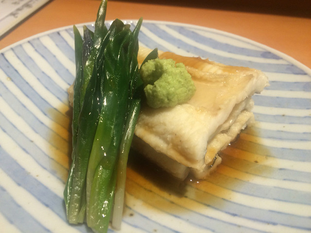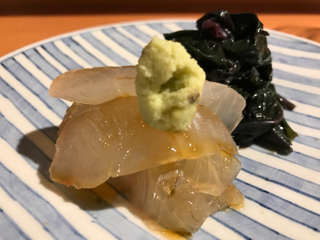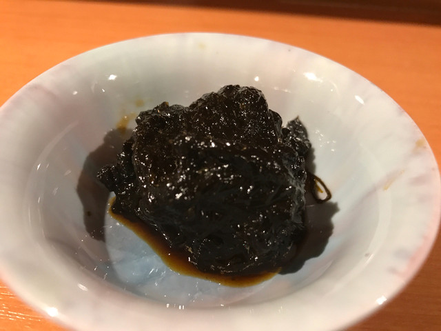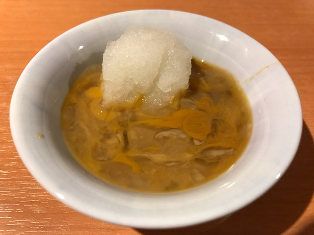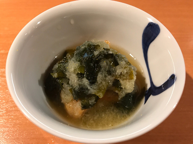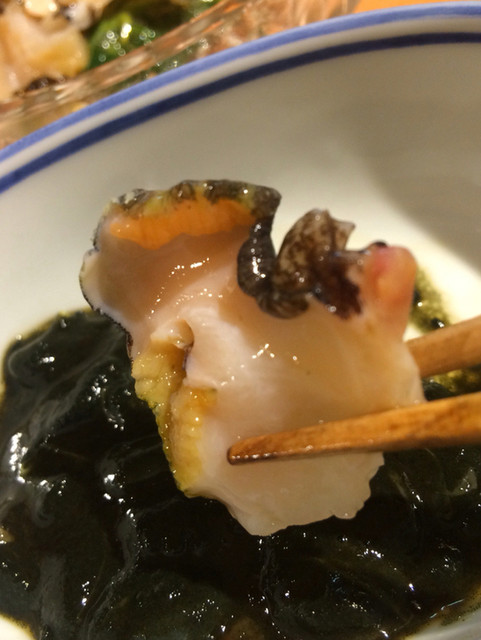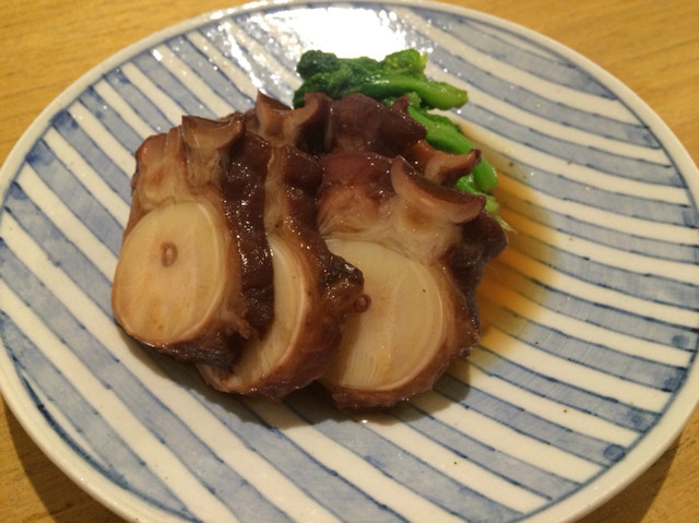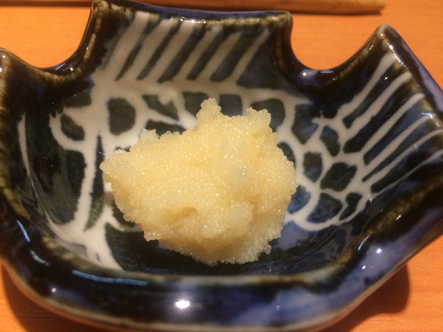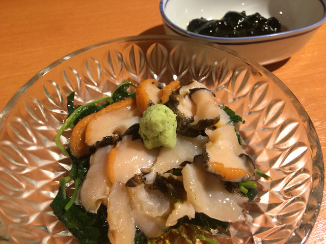 やや小ぶりで締まった鮑は適度な歯ごたえと上品な旨味。雑妙な煮方なのだろう。肝を溶いた芳醇な醤油につけて食べると…唸る。花山葵はカツーンと突き抜ける辛味。味覚のリセットに最適だ。