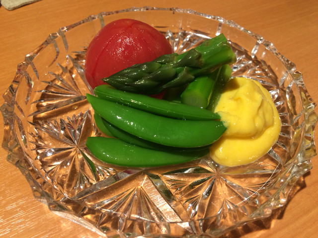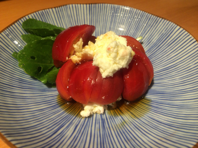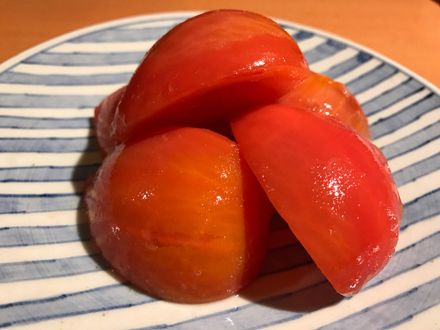 地元、生田の農家から直接買い付けたトマト。とにかく味が濃い、そして、甘い。丁寧に皮をむいてくれている。果物みたいだ。