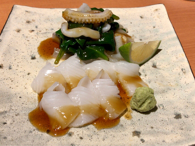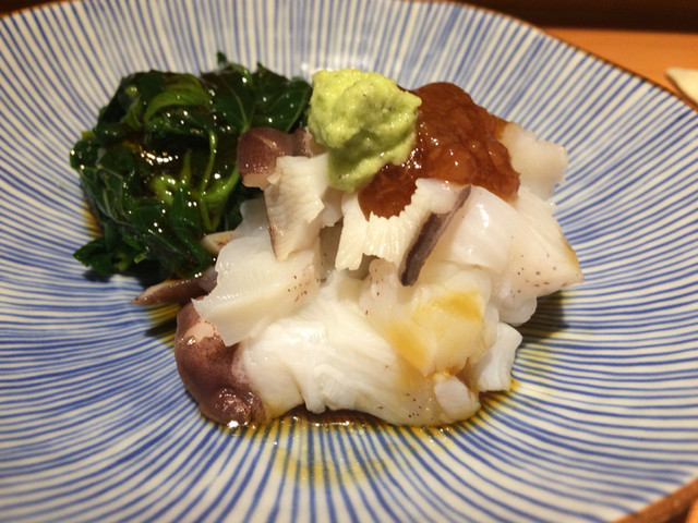 生蛸のわさび梅肉乗せ モロヘイヤとともに