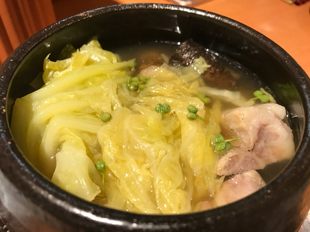 ちりめんキャベツとも言われるこのキャベツは葉の部分がものすごくすごく甘いのだ。それを霧島豚の出汁で優しく煮込んだもの。温まる。