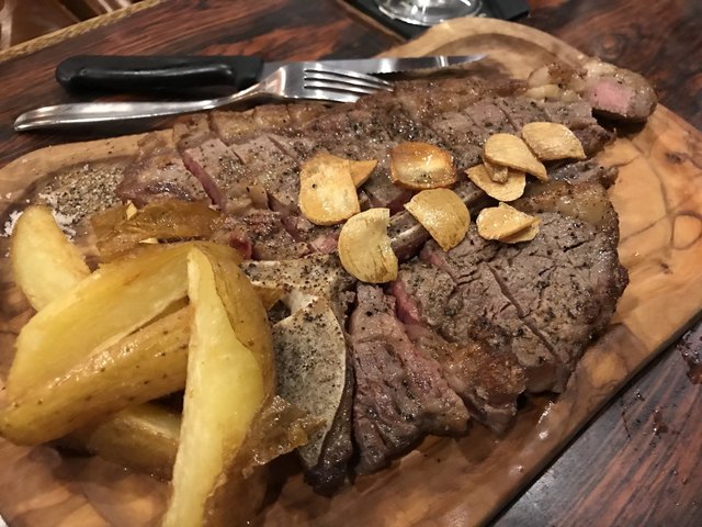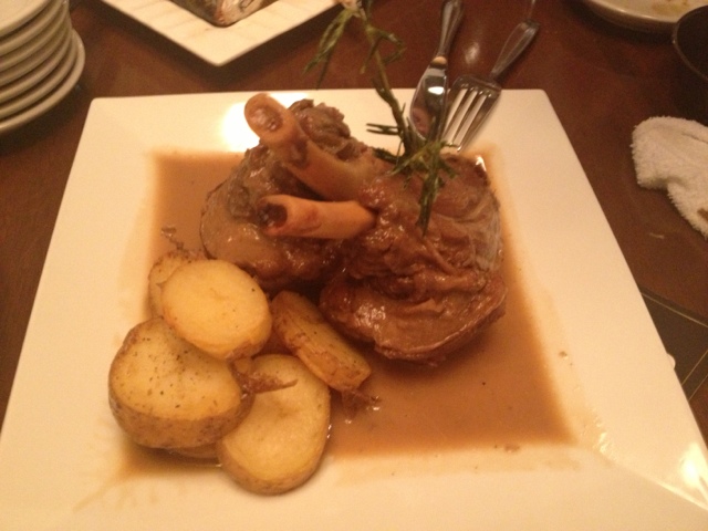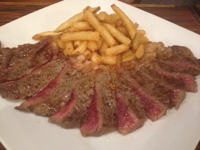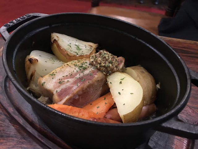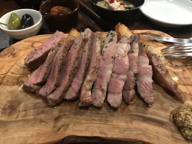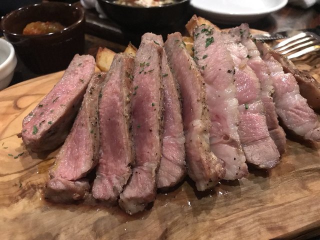 脂肪が気になる我々のために、色々な工夫をしてくれている。付け合せのポテトの上に肉を並べ割るのもいいな。白い器に脂ベトベトなのを見ながら食べたら、いくら美味くても気持ちは悪い。
