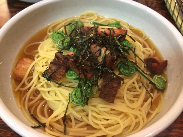 コゴミと厚切りベーコンの和風スパ