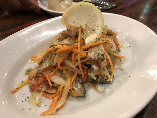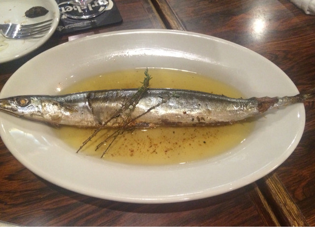 8時間も慎重に油で煮込んだもの。こんなに綺麗な形を保つな為にはかなりの技量と根気が求められる。頭も骨も内臓も全てが美味しく食べられる。