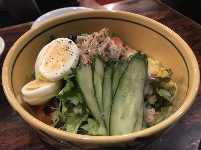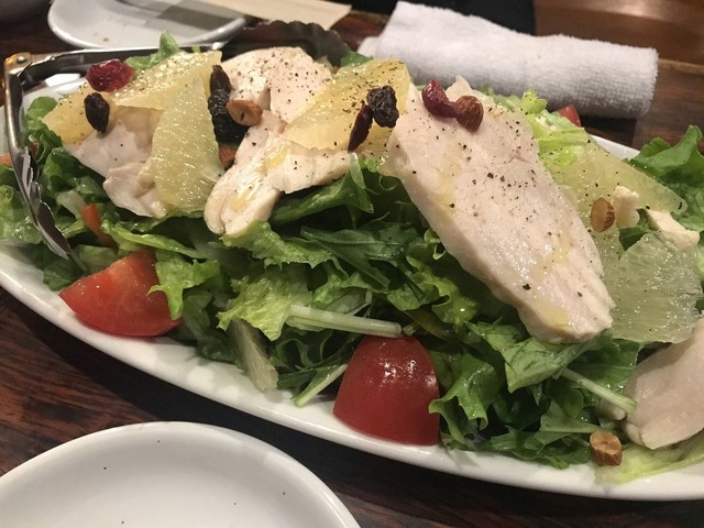 野菜が美味しくタップリ食べられるサラダ。肉の力強さとフルーツの爽やかさと一緒に野菜を楽しめる。さり気なくレーズンも添えられて飽きがこない。