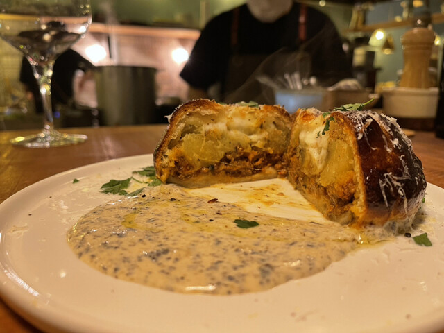 チーズのコクと酸味、ハーブとオイルとチャコールの香りが加わって見た目以上に凝った味わいなのだ。百聞は一食に如かず。