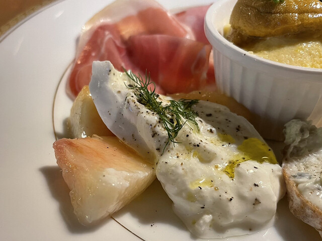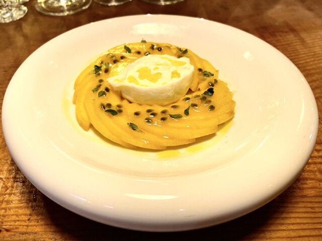 ・桃のカプレーゼはヒンヤリトロンとした食感。瑞々しく爽やかな甘さの桃が濃厚なモッツァレラと良くマッチ。