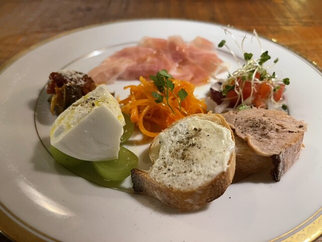 いつもの美味な前菜に、トマトソースの冷静パスタが添えられている。