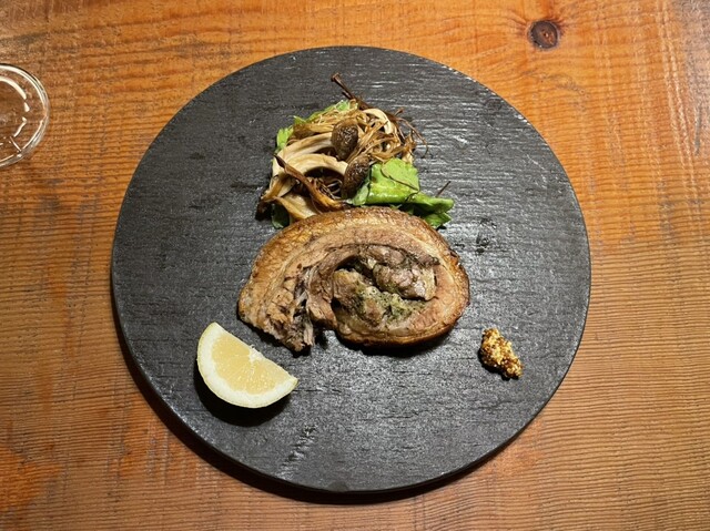 様々な香草を大きな豚肉で巻いて炭火でグリル。