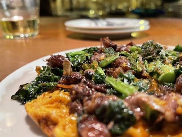 菜の花が食感のアクセント、カラスミが味の奥行き感を演出、玉子の焦げがスパイスとして効いていた。