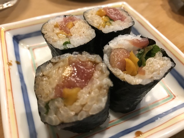 なんとトロたくの細巻きはこのお店が発祥だとか。沢庵の歯応え、シソの香りにトロの芳醇さがシャリで広がって、海苔で締まる感じだ。なるほど、これが本物!