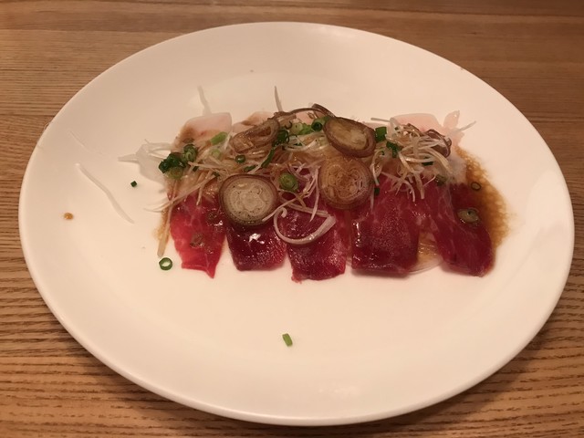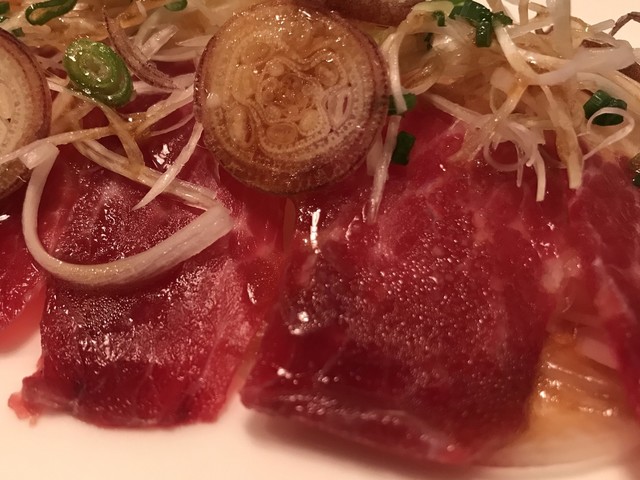 赤白のコントラストがとても美しい。「ゆっくり食べて。脂が溶けてくると甘みが出ますよ」とシェフのアドバイス。その言葉通り、歯応えと味の深みが変化してくる。ミョウガと2種のネギとの相性も良し。