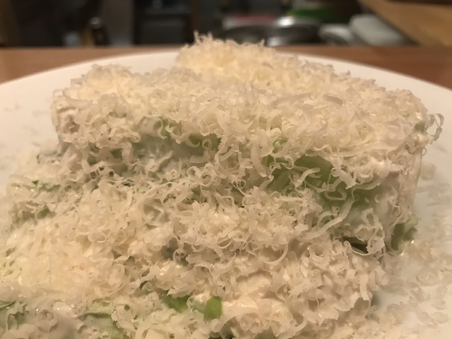 深みのある味わいのチーズソースで和えたパリパリのレタスにごうかにパルメジャーノを振りかけて。微かにアンチョビ感。