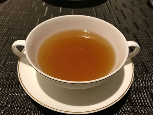 淀みなく透き通る琥珀色のスープ。それが真白の器に注がれて。ただそれだけのシンプルな出で立ちに伝統とポリシーを感じる。