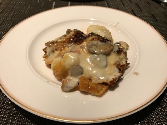 このホテルの味の基準は全体的に薄塩と感じる。途中で、軽く塩を振ろうとしたが、卓上の立派なミルで岩塩を引くもかなり粗めの粒子となる。そのジャリッとした歯触りが繊細な中で楽しんできた味わいの印象を変えてしまう。勿体無いな。
