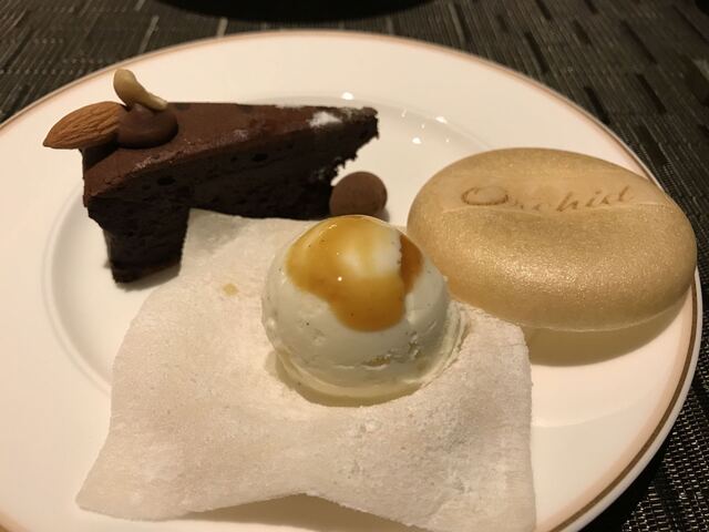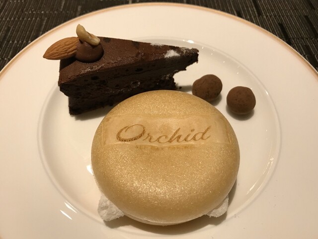 そして、デザートの最中は演出を含めて特筆すべきだろう。お店の中央にあるオープンカウンターで可愛らしい女性のコックさんが作ってくれる。オーキッドのロゴが焼印された最中の上に求肥を広げてバニラアイスを乗せてカラメルソースを。求肥で包んで最中の蓋を被せて完成。その所作がとても優雅。そして、美味し。アイスを求肥で包んだおかげで最後まで最中のパリパリ感が続く。バニラアイスの豊かな乳感とコクのあるカラメルの甘み、パリッとした最中とモチっとした求肥の食感。なんとも充実した一品だ。