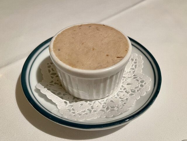 絶妙なタイミングで出されたこのグラニテは爽やかな紅茶の香りとほろ苦さ。濃厚な料理の後の緊張感を一気に解いてくれる。