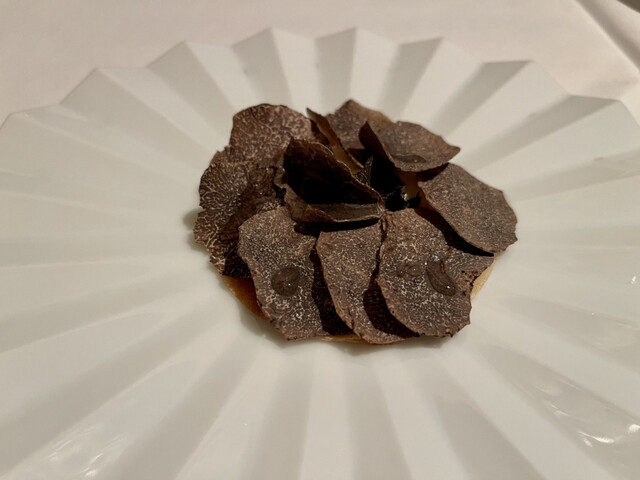 出ました。贅沢な冬の珍味。そのトリュフがたっぷりとトッピングされ、その香りが周囲に広がっていく。それを柔らく焼かれたブリックで包んで食すのだが、これがなんとも夢見心地になる味わいだ。トリュフのコリッとした素朴な食感と弾力性を伴ったフワッとしたブリックの生地の食感の対比が奥の深い贅沢な感覚。そして、鼻から抜けてくる芳醇な香りは外から直接嗅ぐそれとはまた異なった美味さだった。食べ進めると感じるボリュームの充実感がまた嬉しい。