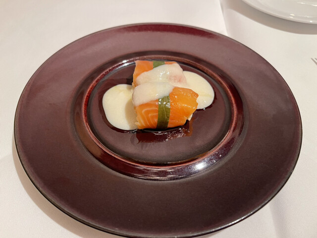 ややストイックに感じるなんとも斬新な外観。透明なガラスの上に、底の深いガラスの器。その中に三陸の牡蠣とムース、その上に有明の生海苔、そして海水のジュレがとピングされている。キラキラとしたガラスにモノトーンの積層がデザインセンスを感じさせる。そして、その味も初体験。生海苔の旨味と海水のジュレが醸し出す磯の感覚とクリーミーなムースが溶け合ったときに生まれる上品なコク、宝物のように大切に置かれた牡蠣の美味さ。