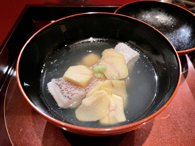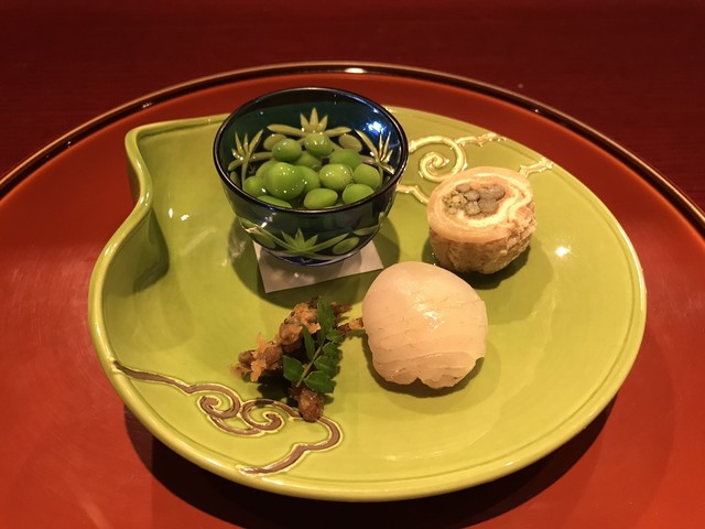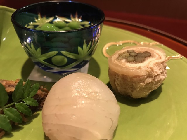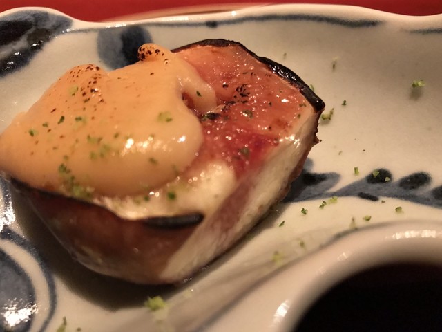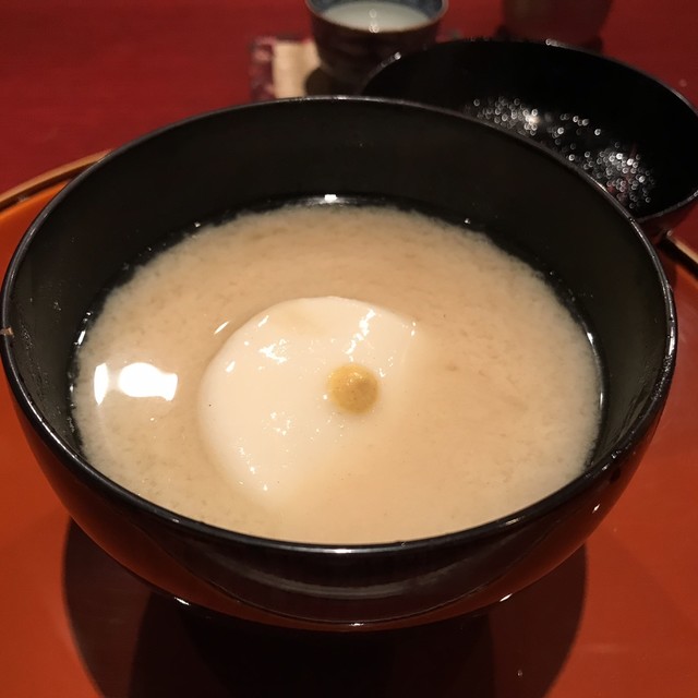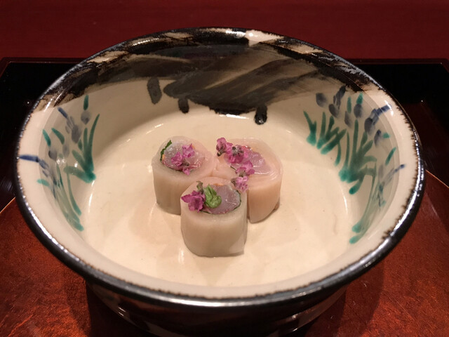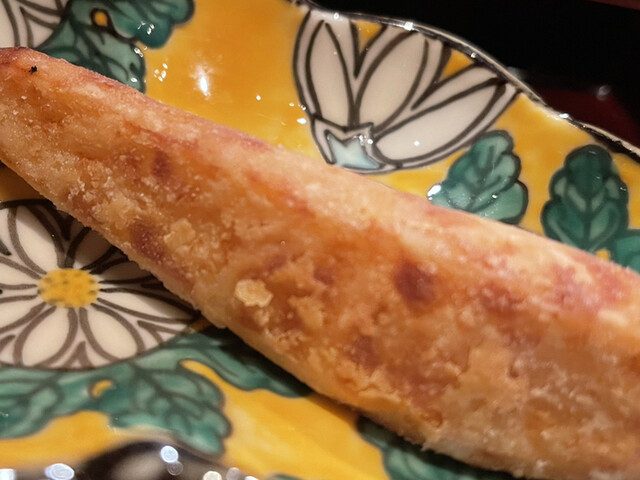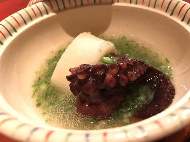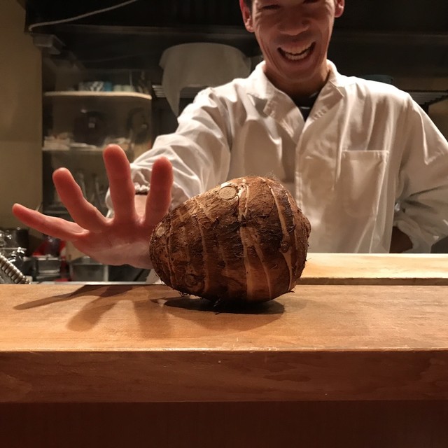 巨大な海老芋を数種の出汁で何度も炊いて最上の甘さを引き出すのだとか。サクッと熱々を頂く。甘さの奥に粋な旨味あり。