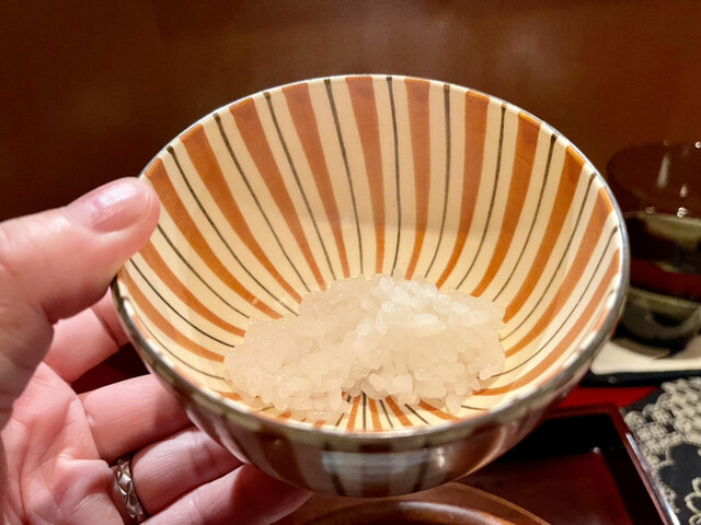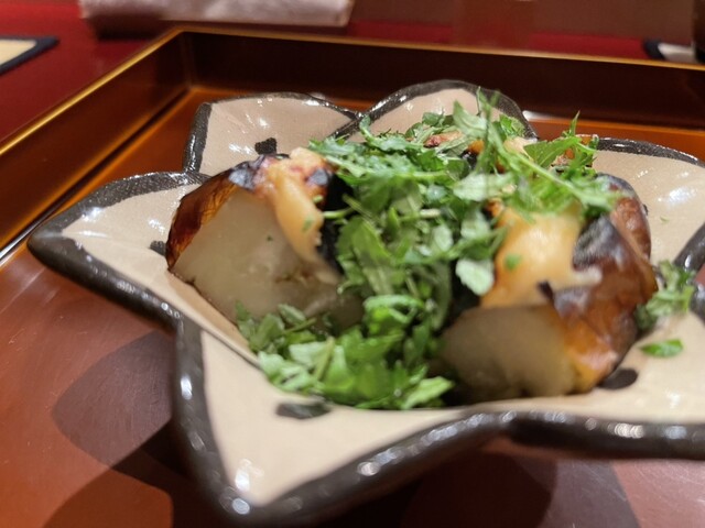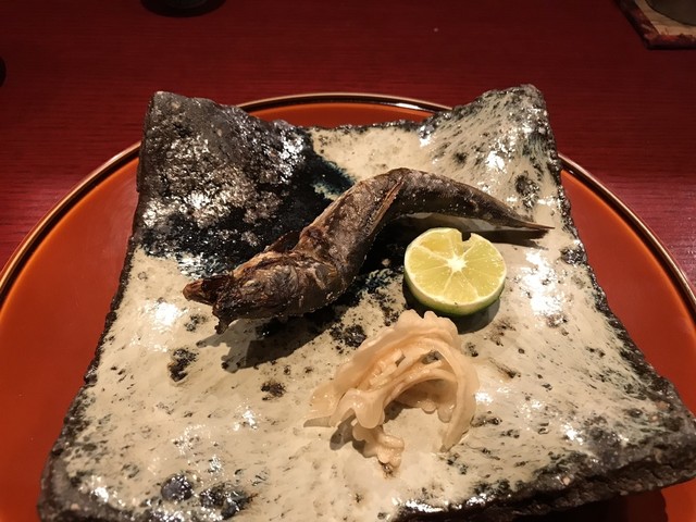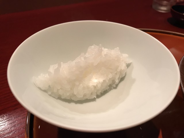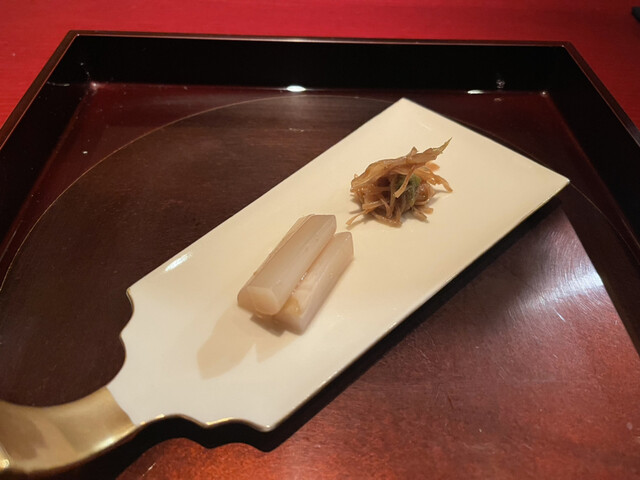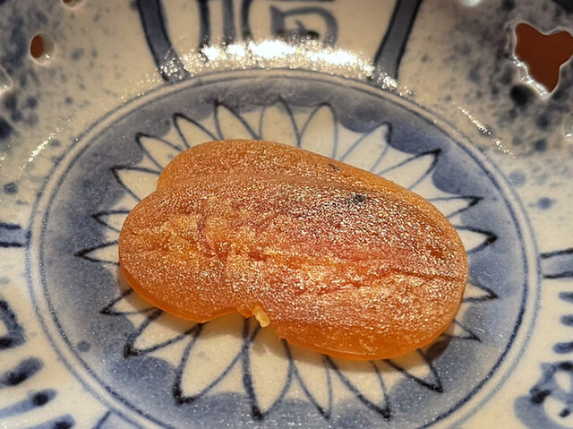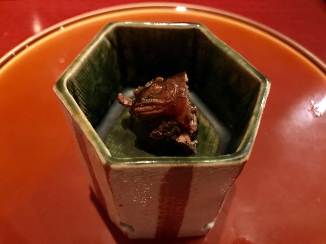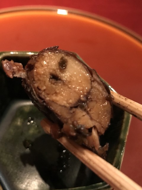 奈良の希少な子持ち天然鮎は小振りで引き締まった感じ。絶妙な加減で甘露煮されて輪切りにされ積まれている。その断面は繊細で綺麗だ。肝の上品な苦味が加わり、とても知的で官能的な味わいに。天然でないとこの味にはならないとのこと。贅沢。