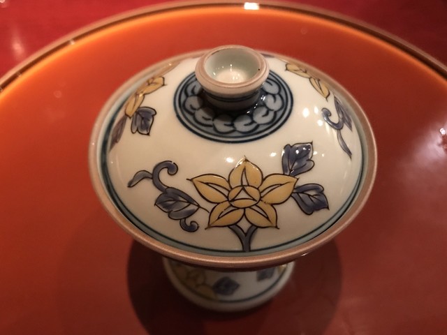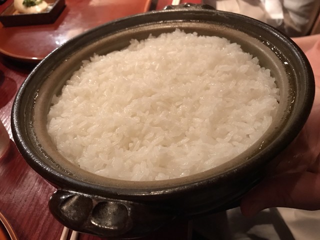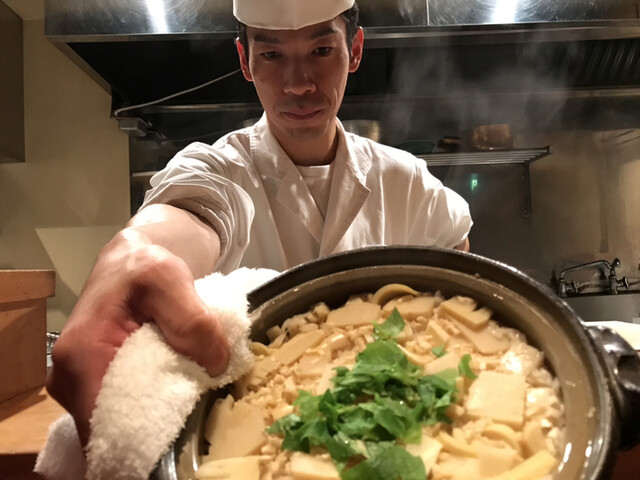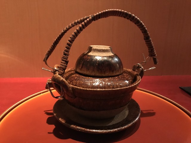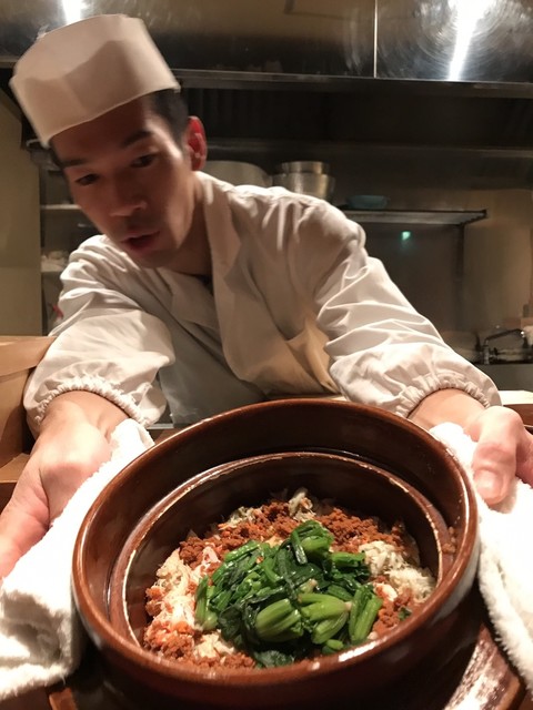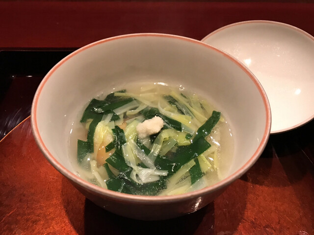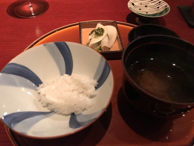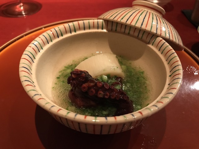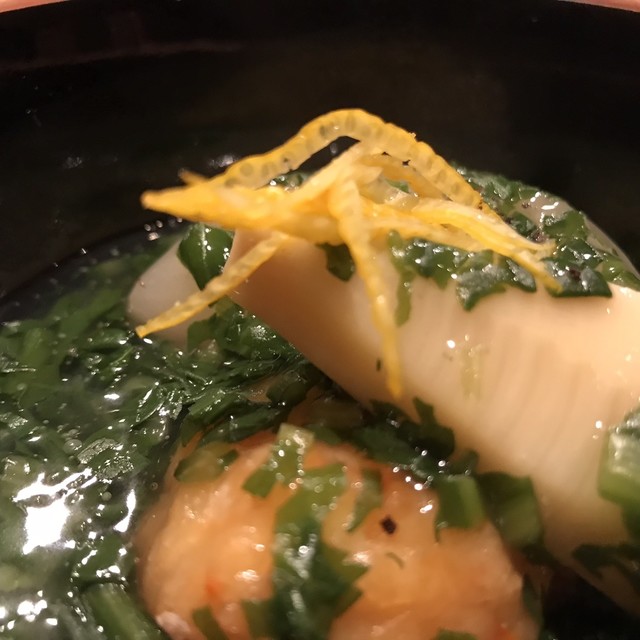 刻み春菊の鮮やかな緑。とろみのついた出汁には重層的な旨味が感じられる。聖護院大根は炊き具合良く、繊維と微かな辛味を残した感じだ。海老芋の甘みとねっとり感。贅沢な野菜の旨味の中で鴨の食感と脂味が効果的なアクセントになっていた。知的な料理だ。