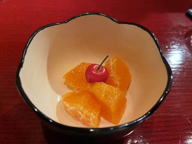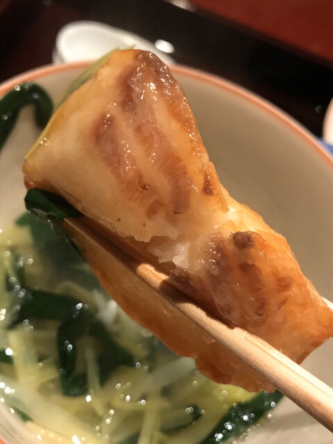 春菊あんの緑と針柚子の橙が加わりとても彩の豊かな一皿だ。それぞれに掛けられた下ごしらえの手間に感心。それらの旨さの特徴を優しいあんで纏めている。