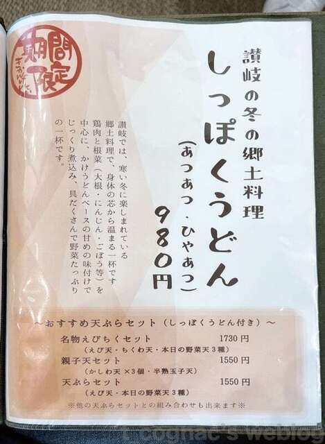 店内待ちの間にお品書きが渡されるので、何をいただくか、じっくり検討。おすすめは天ぷらセットのようだが、今回はうどんのみを堪能することにした。