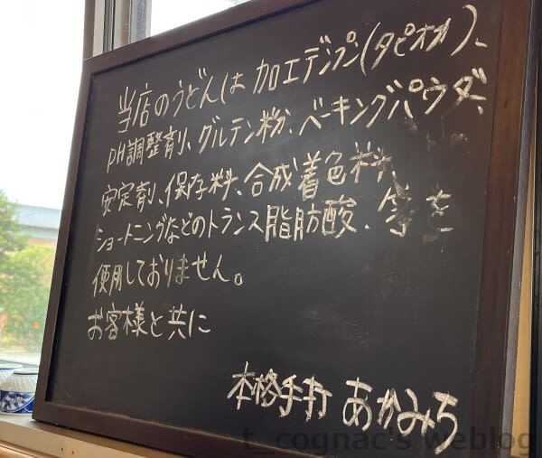 テーブル席の傍には、同店のうどん作りについてのポリシーが書いてあった。