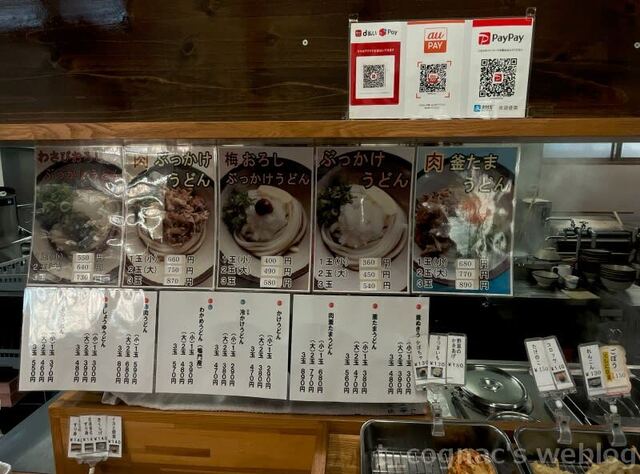 先の看板のところを過ぎると、注文コーナーにさしかかる。注文口でうどんの種類を告げ、トッピング類の並ぶカウンターで好みのものを選んでとって、出来上がったうどんと引き換えにお会計するという流れ。