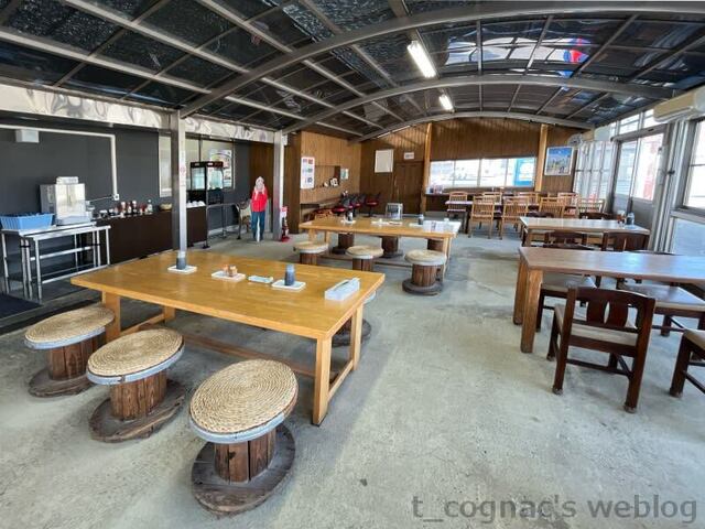 その後、超大型カーポートを応用して設られた感じの広大な客席スペースに移動する。お冷や薬味の類はこのスペースの片隅にまとめて置いてあるので、セルフサービスで適宜利用する。またここに瑠美子ばあちゃんの等身大パネルもあるので記念ツーショットを撮ることも出来る(?)そしてココでうどんをいただいたら、画像の奥にある専用出口から退店する、という一方通行システムが確立されている。
