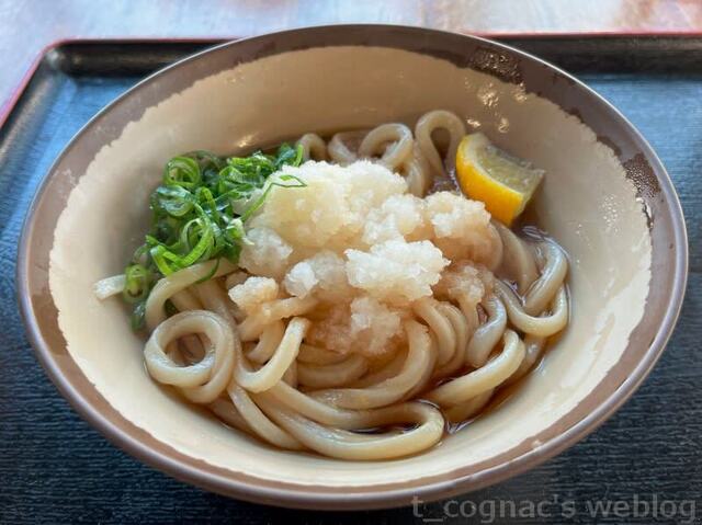 同行者の「しょうゆうどん」は、セルフサービスの大根おろしで「おろししょうゆうどん」にして、さらにレモンでさっぱりと。冷たく締まった麺のモチツルグミっ!が素晴らしいとのこと。