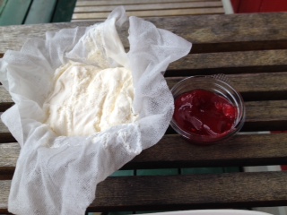 ガーゼに包んだ、マスカルポーネ&フロマージュブランチーズ合わせて作ったチーズケーキ。