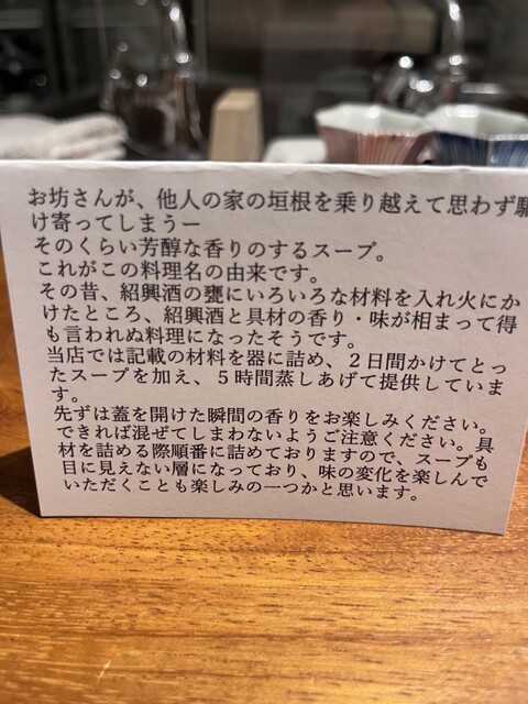その昔、紹興酒の甕にいろいろな材料を入れ火にかけたところ、紹興酒と具材の香り・味が相まって得も言われぬ料理になったそうです。
