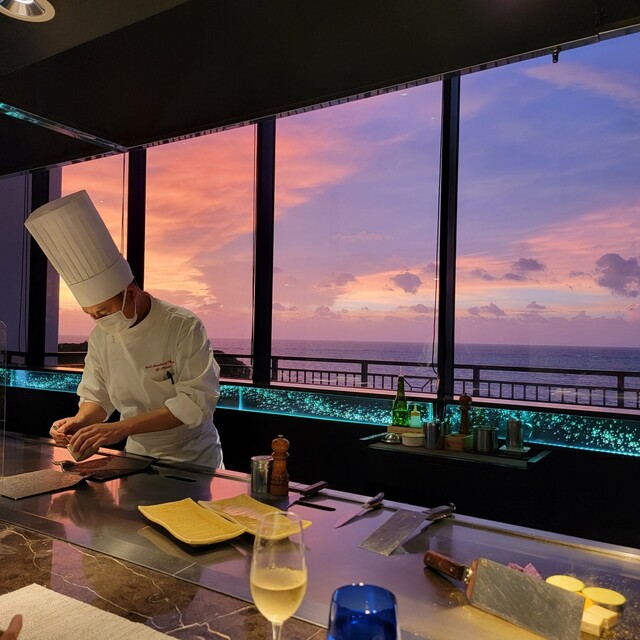 季節によって日没は位置がずれるかもしれませんが、刻々と表情を変えていく空と海の美しさは筆舌に尽くしがたい。なので写真を載せました。横長の大きな窓はまるでサンセット劇場。シェフが主役なのか食材が脇役なの...