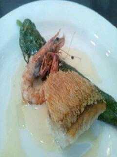 鯛のパリパリ焼き、万願寺とうがらと海老のしソテー添え