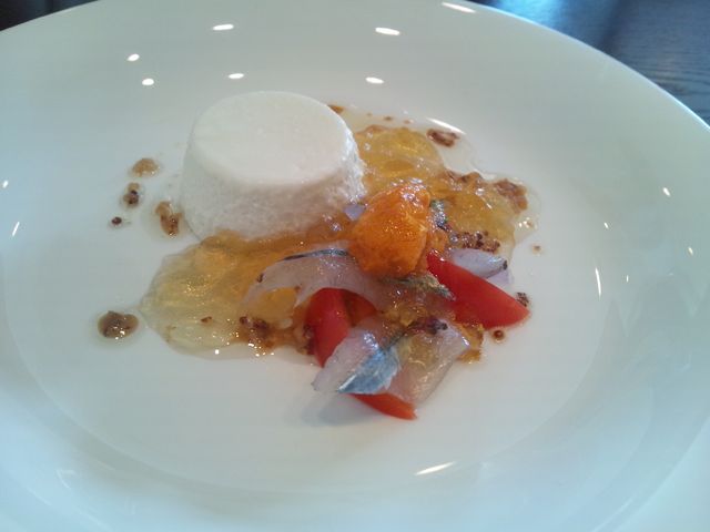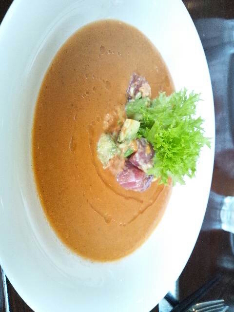 まず出てきたのはマグロとアボカド(ウニもいた。)のタルタル withガスパチョスープ。あ~なんで好みが判るの?このスープソースでフランスパン一本食べられそう(笑)