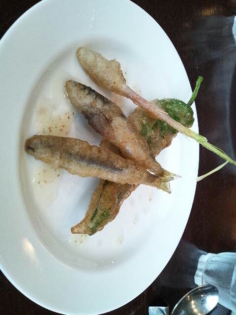 つぎは魚。チアユと生姜と万願寺唐辛子のフライ。美味し!チアユの苦味が春を感じます。あ、夏か~♪
