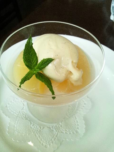 桃tのコンポート。十八番です。バニラビーンズたっぷりのアイスもおいしい~