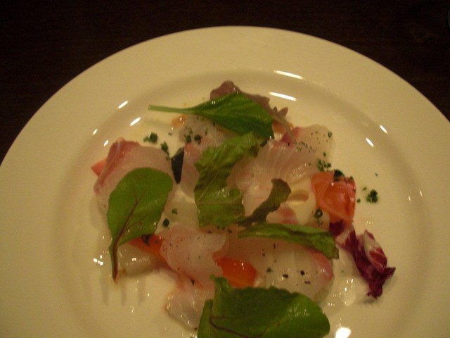 数種のピクルスの上に石垣ダイのカルパッチョ