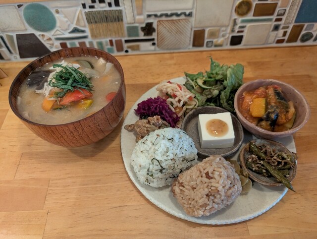 茄子の黒甘酢がらめ、ひじきと根菜のゴマみそサラダ、ひよこ豆のマリネのようなものも美味しかったです。
