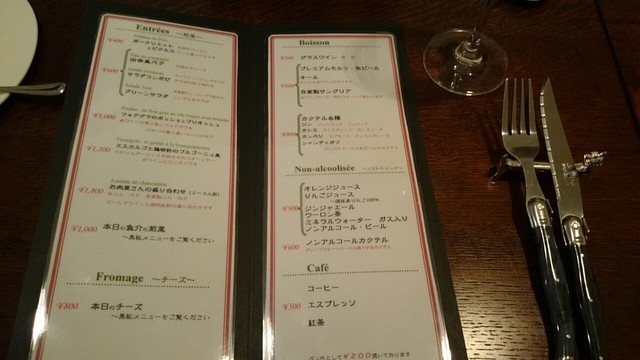 横長の店内は二人掛けのテーブルが七つ、14席。テーブルも椅子もガタつきなくしっかりしたものです。テーブルクロスなし。膝ナプキンあり(紙)。ラギオールのナイフ、フォーク(使いまわします)。
